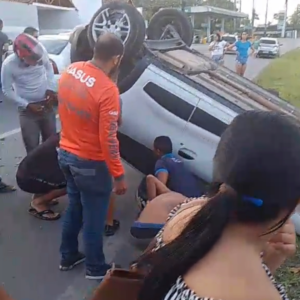 Carro capota após colisão frontal; vítima foi socorrida se queixando de dores no pescoço