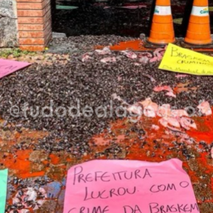 Sururu e tinta simbolizando sangue: sede da prefeitura de Maceió é alvo de protesto por acordo com a Braskem