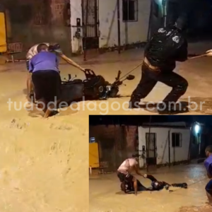 Motociclista cai em buraco de obra de tubulação alagada e é resgatado por população no bairro do Jacintinho, em Maceió