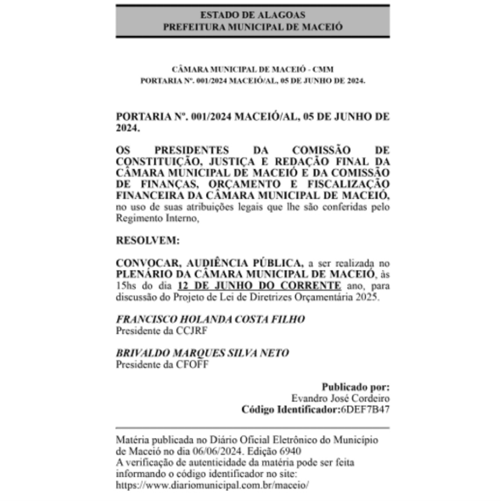 O chamado da população e das organizações da sociedade civil foi publicado na edição desta quinta-feira do Diário Oficial do Município. O ofício está assinado pelos respectivos presidentes: vereador Chico Filho (PL) e Brivaldo Marques (PL).