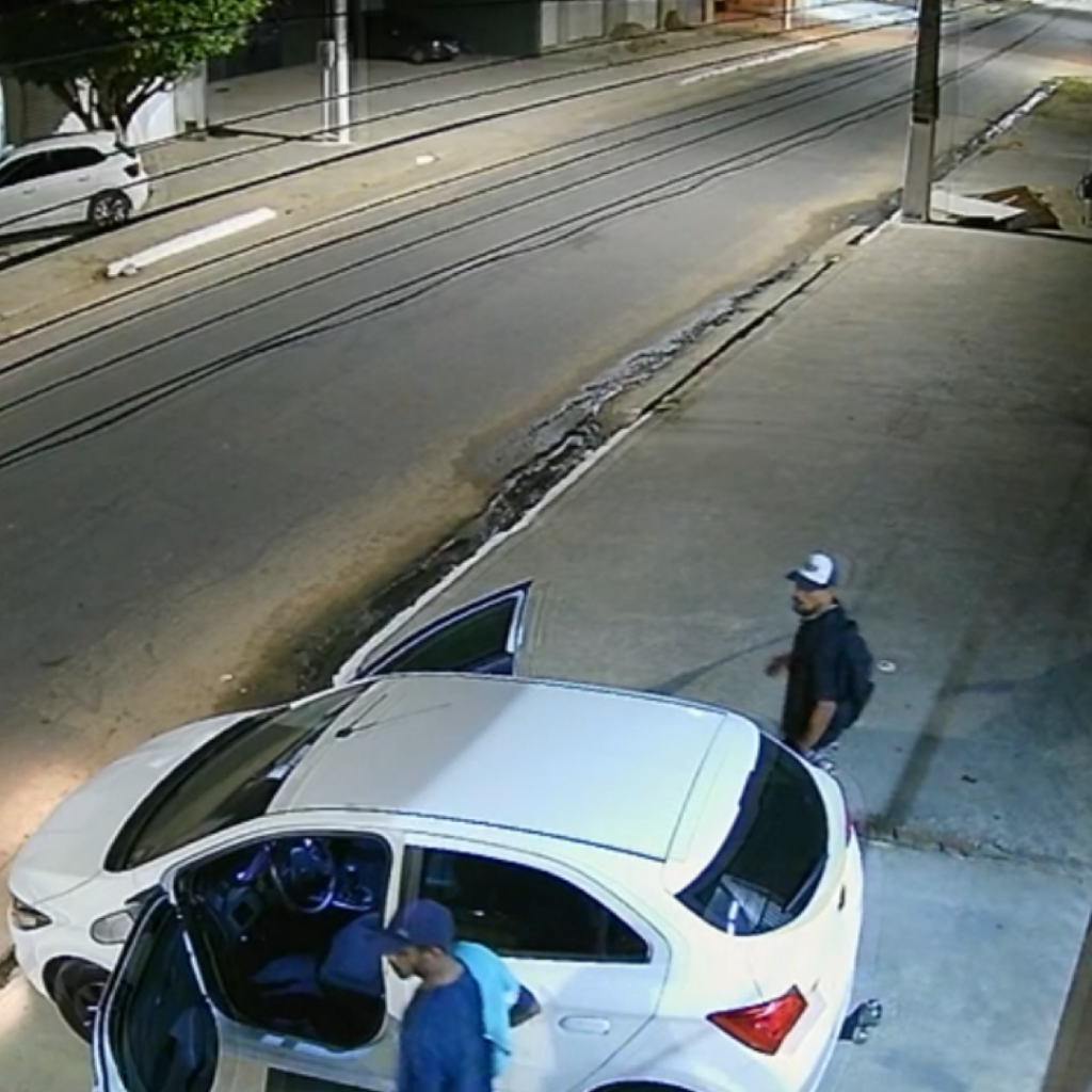 Um dos suspeitos está usando camisa azul e bermuda jeans e o outro camisa preta com bermuda estampada. Ambos estão usando bonés. O veículo possui a placa do padrão Mercosul, com a codificação QWR6C78.