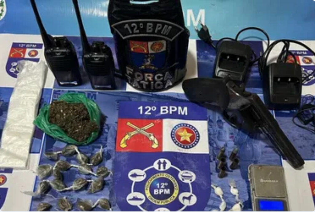 Na ação, foram apreendidos um revólver calibre 38 com duas munições intactas e três deflagradas, além de porções de maconha, cocaína e uma balança de precisão.