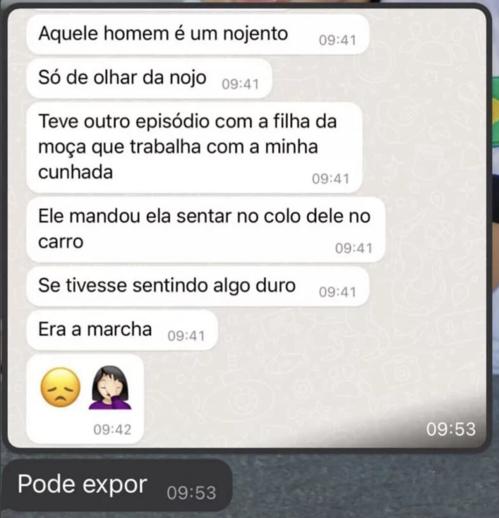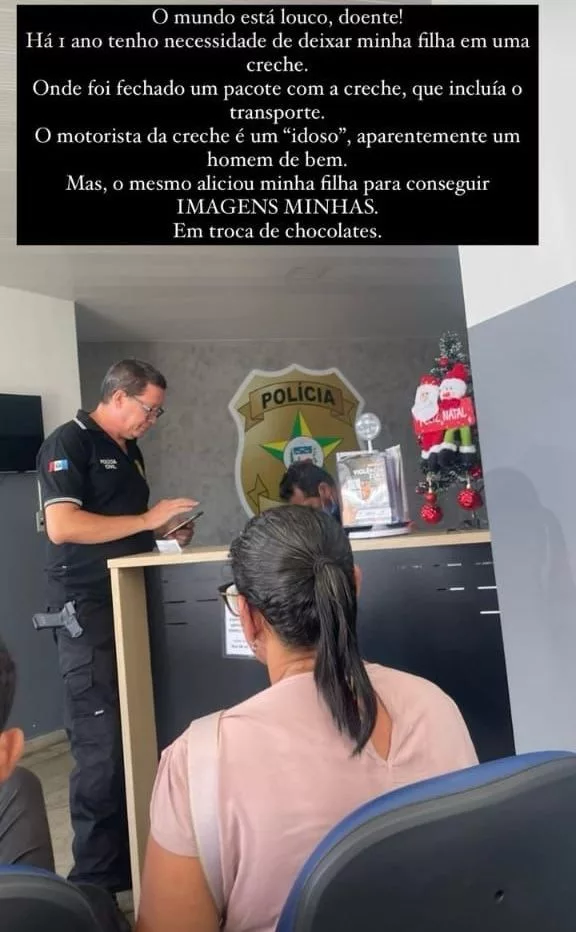 A vítima afirma que o idoso é motorista e faz o transporte escolar da creche. O suspeito – segundo a mãe – estava pedindo à sua filha que lhe conseguisse fotos. O homem oferecia chocolate em troca das imagens.