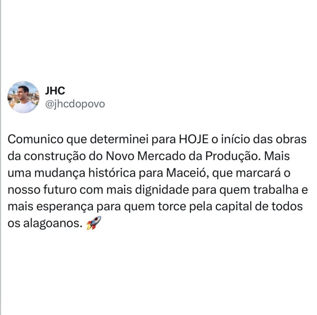 O prefeito de Maceió, JHC, anunciou nesta terça-feira (23) o início imediato da construção do novo Mercado da Produção, em uma resposta rápida e firme após o incêndio de grandes proporções que atingiu oito barracas nas proximidades do equipamento público. A decisão foi apresentada como um marco para a reestruturação de um dos espaços mais tradicionais do comércio popular da capital.