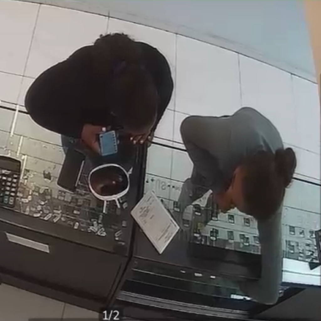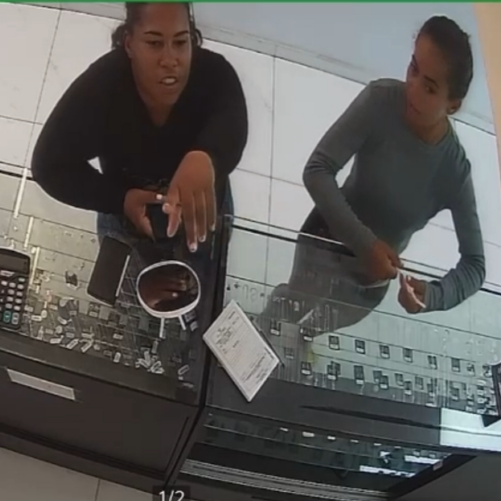 Neste momento, uma delas se estica e coloca a mão por trás do balcão de vidro, onde estavam expostos, aparentemente, itens como anéis e colares. Enquanto isso, uma das três fica na porta, observando a passagem das pessoas.